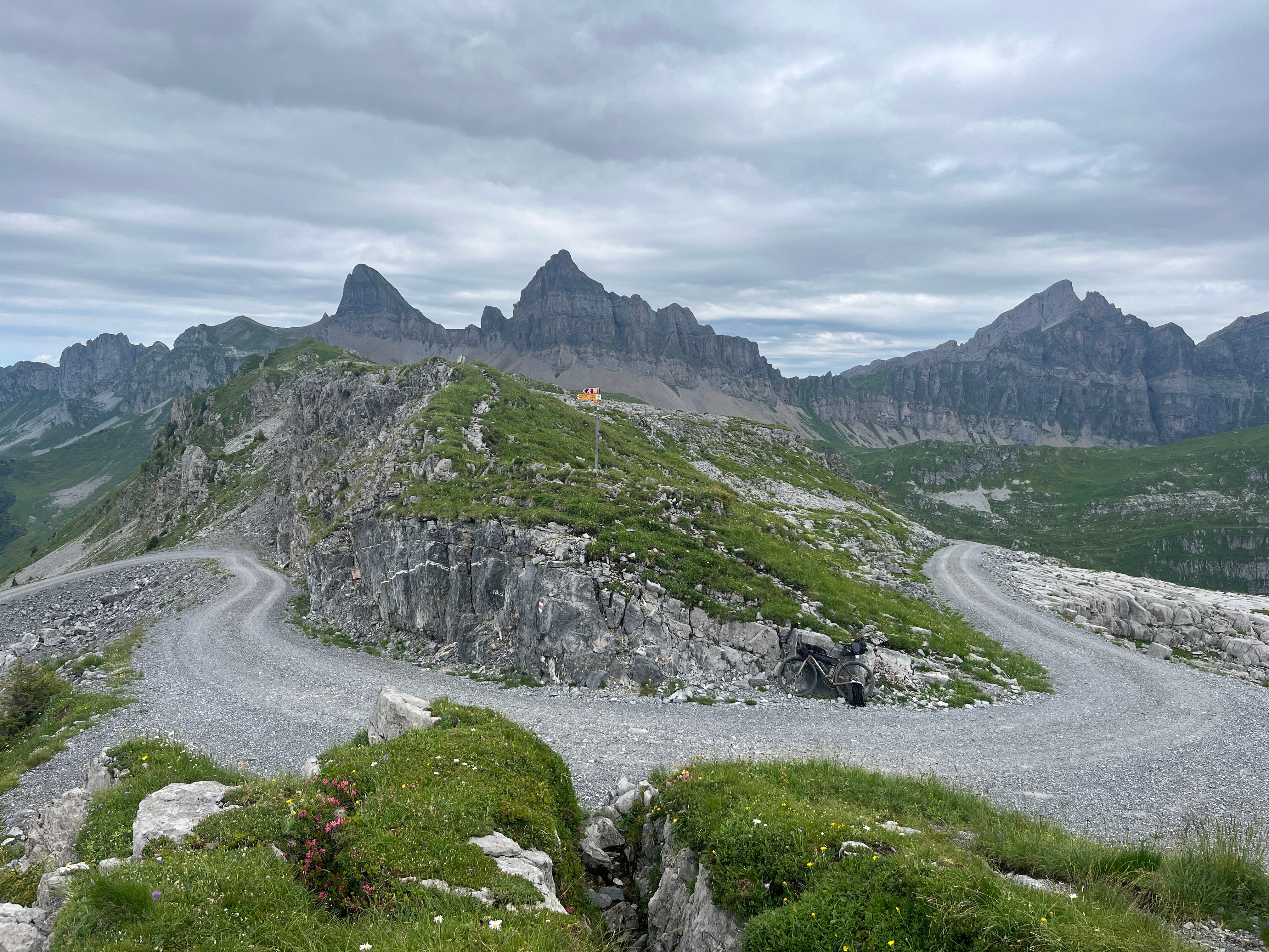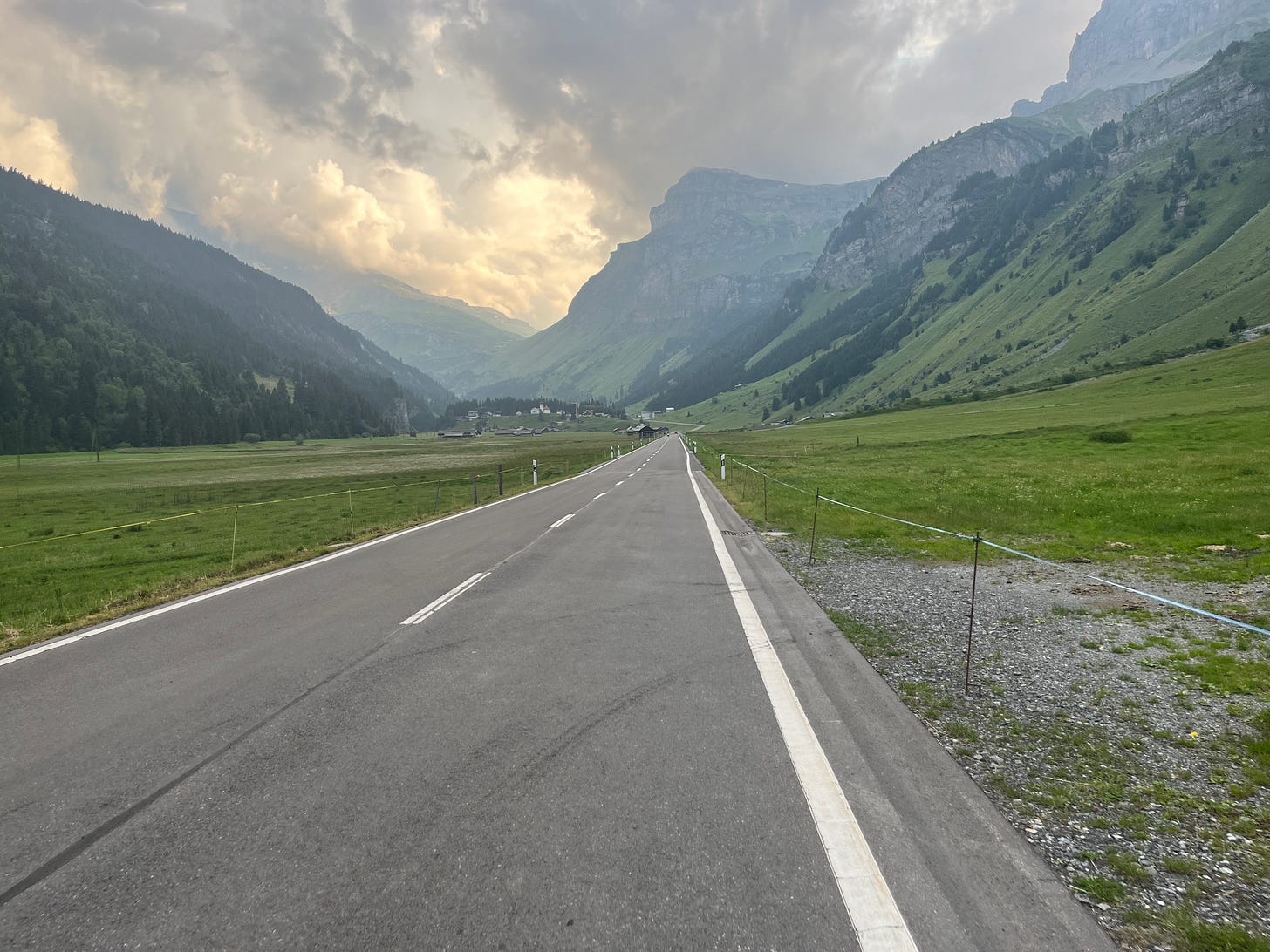 Retour sur la route asphaltée du Klausen non loin d’Urnerboden qui marque l’entrée dans le canton d’Uri. Cela rime avec un rendement accru, boosté par une déclivité décente, et motivé par une surprise « attendue » au col. La vallée s’élargit, tout est calme, l’atmosphère est impressionnante. La luminosité baisse, tout comme la température.