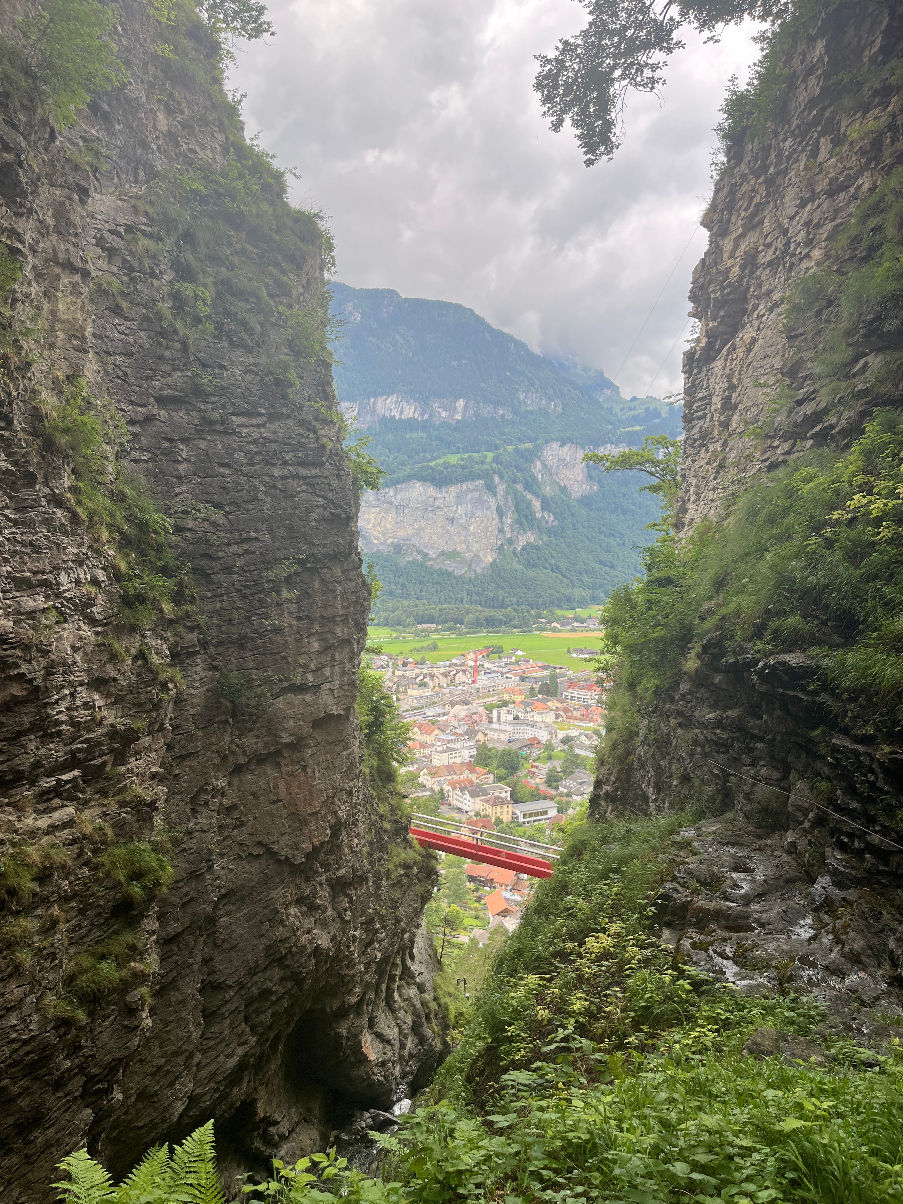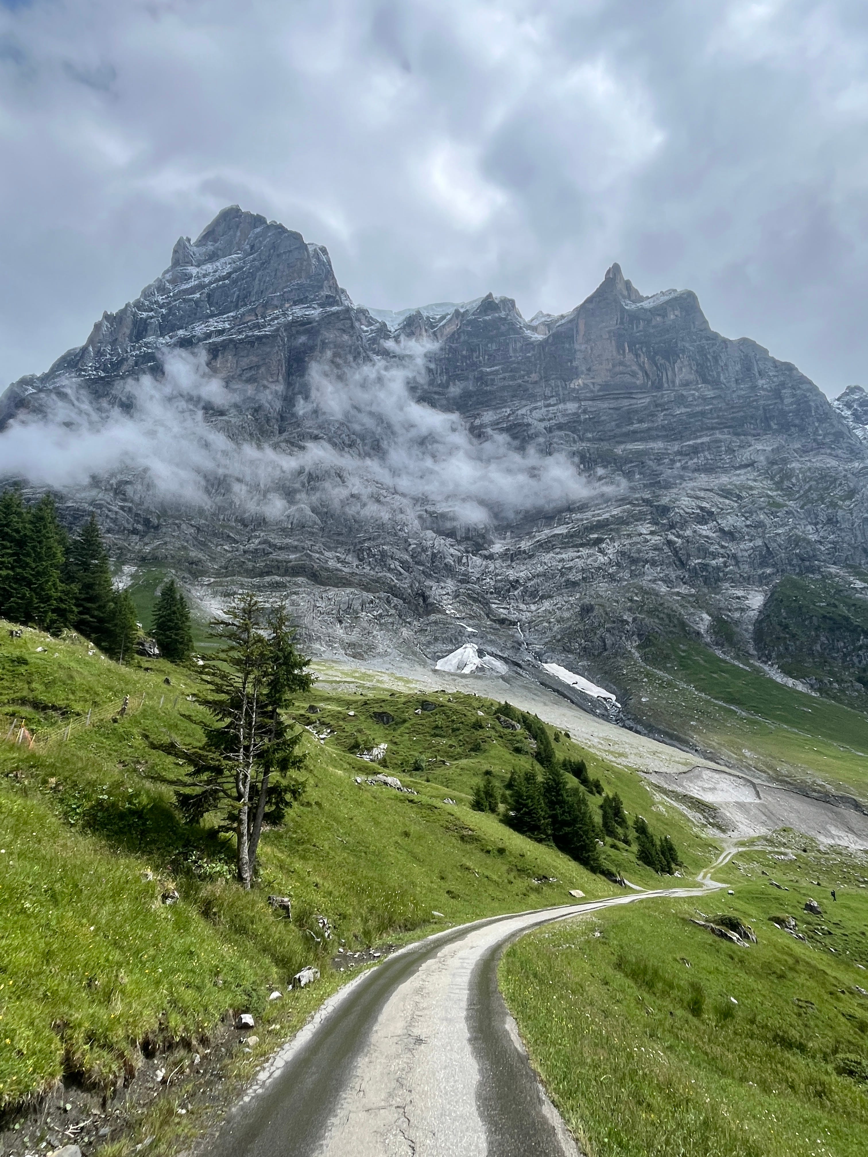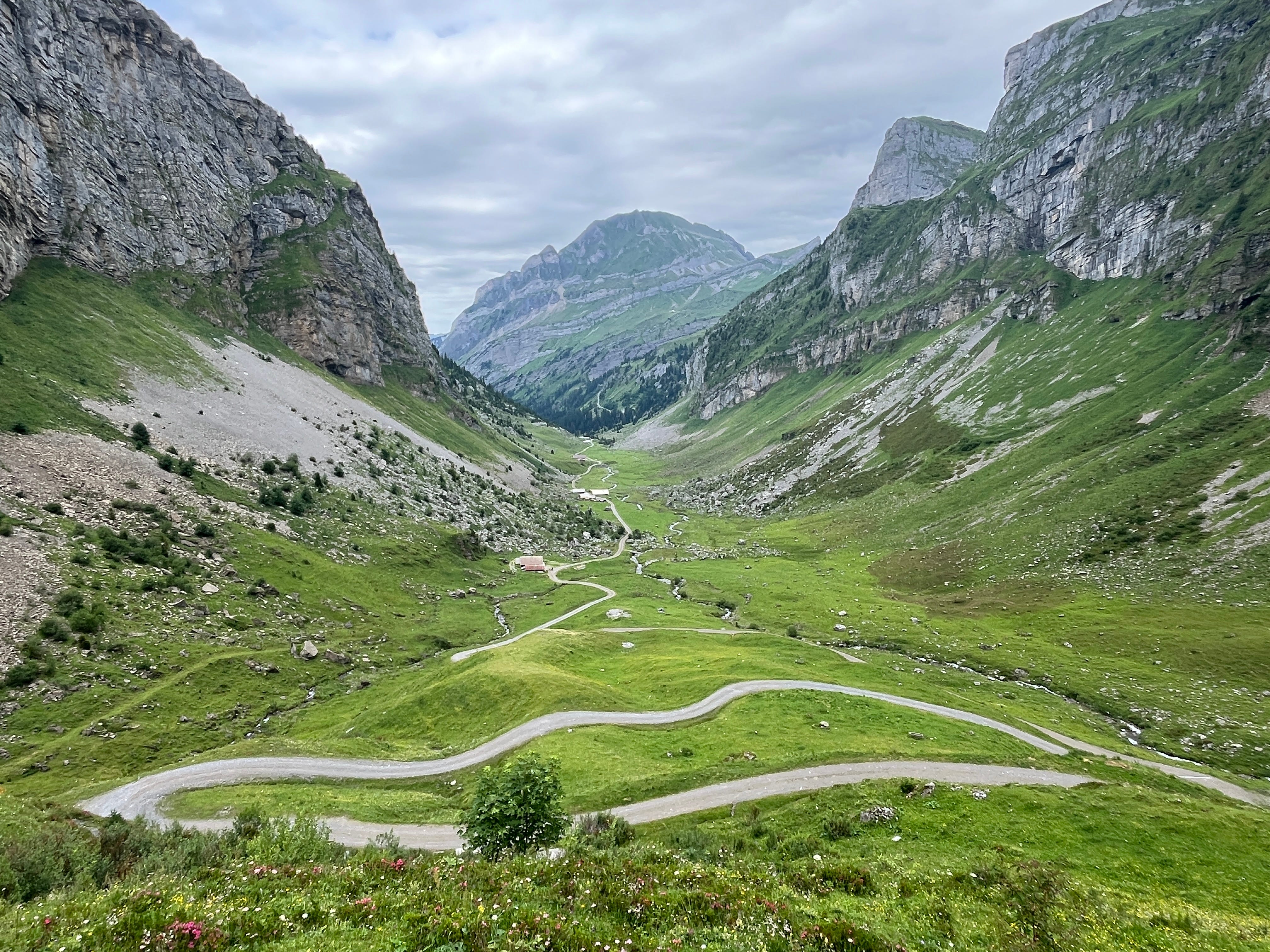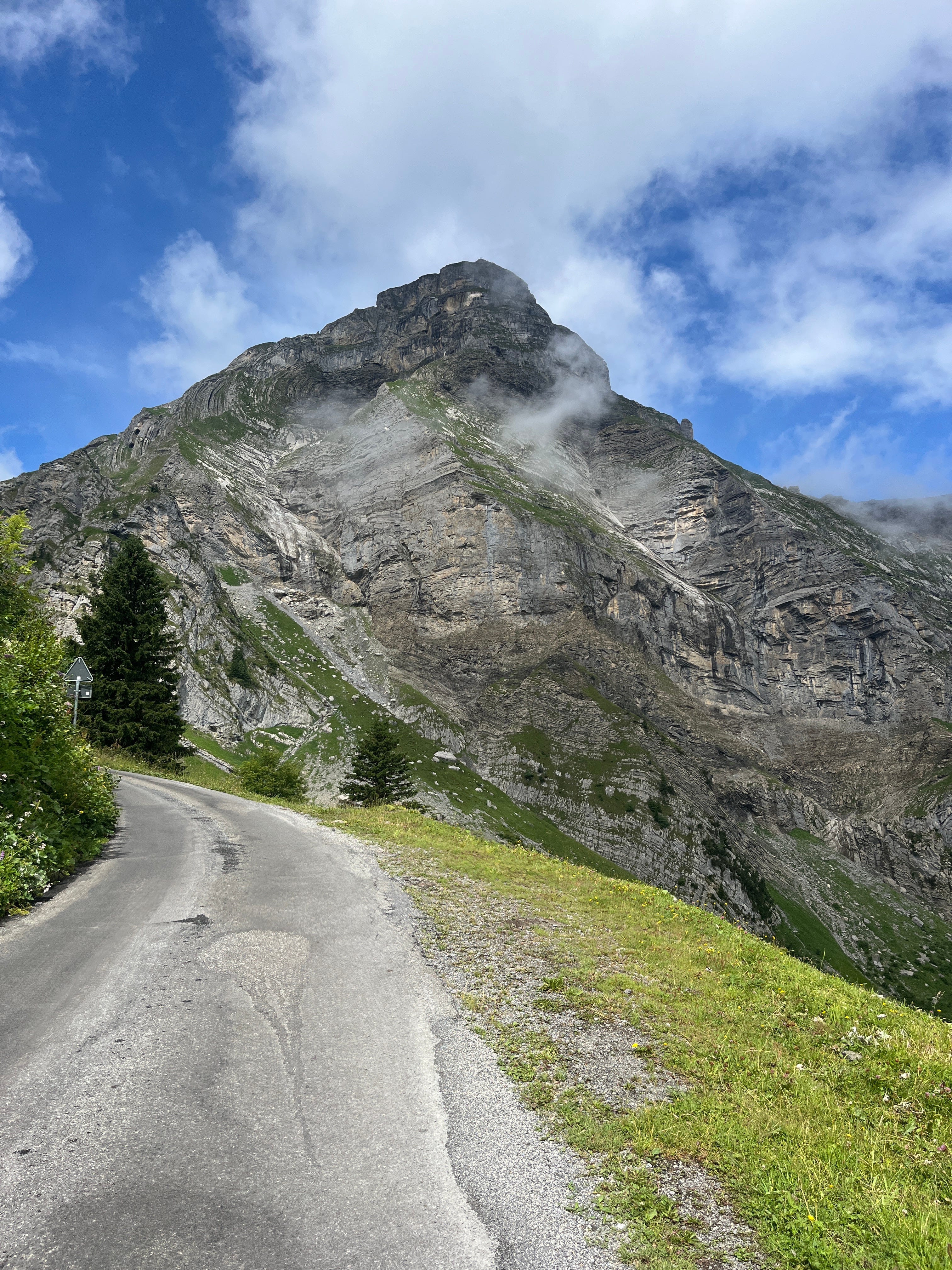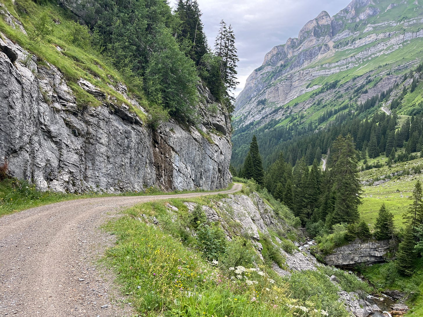 La petite route devient chemin, puis sentier. Un intermède technique bienvenu qui donne pleinement sens à l’utilisation d’un vélo typé « gravel ». De courte durée puisque le bitume reprend ses droits sur la route pour descendre à pleine vitesse la belle vallée de Gäntel. Quelques coups de pédales plus tard je rejoins Hasliberg avant de basculer sur Meiringen et découvrir l’existence des gorges et cascades de l’Alpbach, pour le moins très escarpées. Une petite balade pédestre avant de rejoindre la ville de Meiringen.