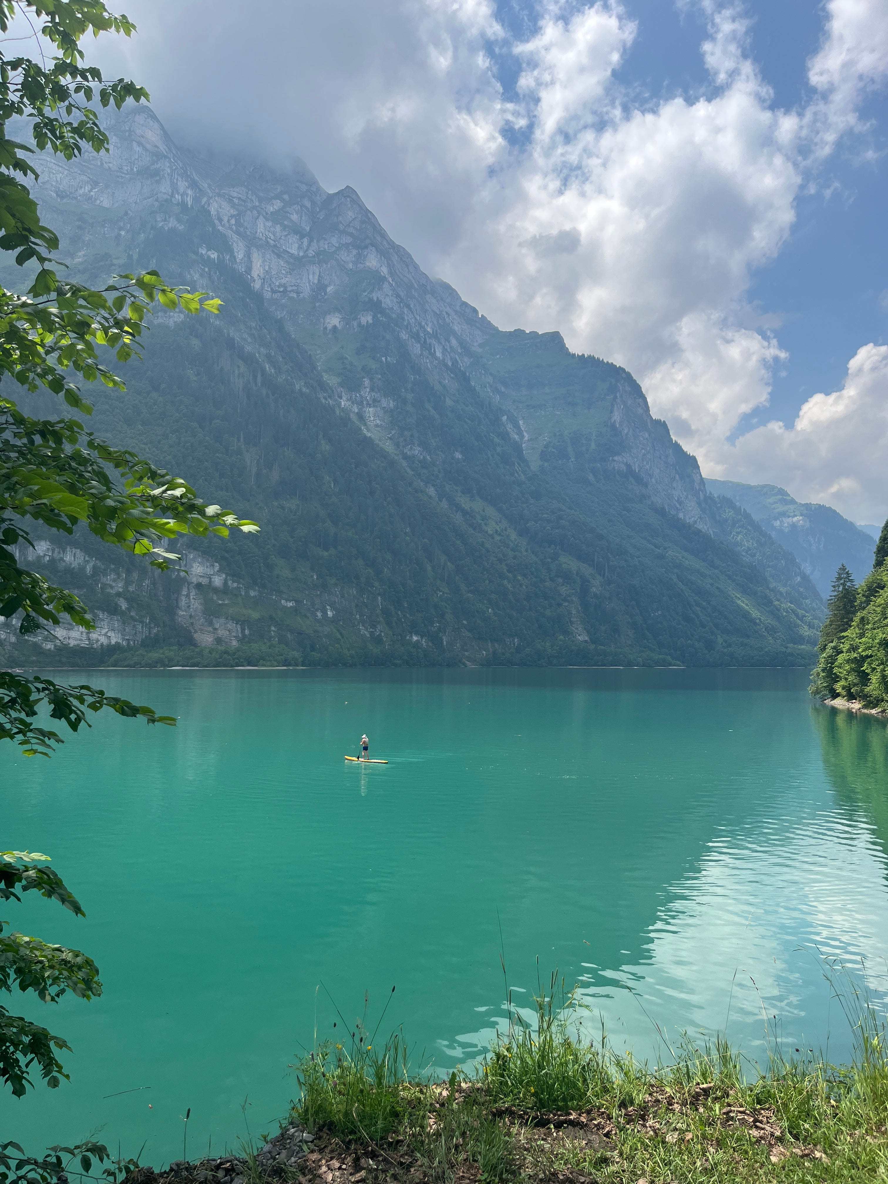 Le magnifique lac de Klöntal se dévoile ensuite bordé d’imposantes falaises. Au terme d’une longue descente, une halte mécanique s’impose à Glaris et Ennenda. Sucre, plaquettes de freins et quelques discussions avec le vélociste du coin sur la suite de l’itinéraire.