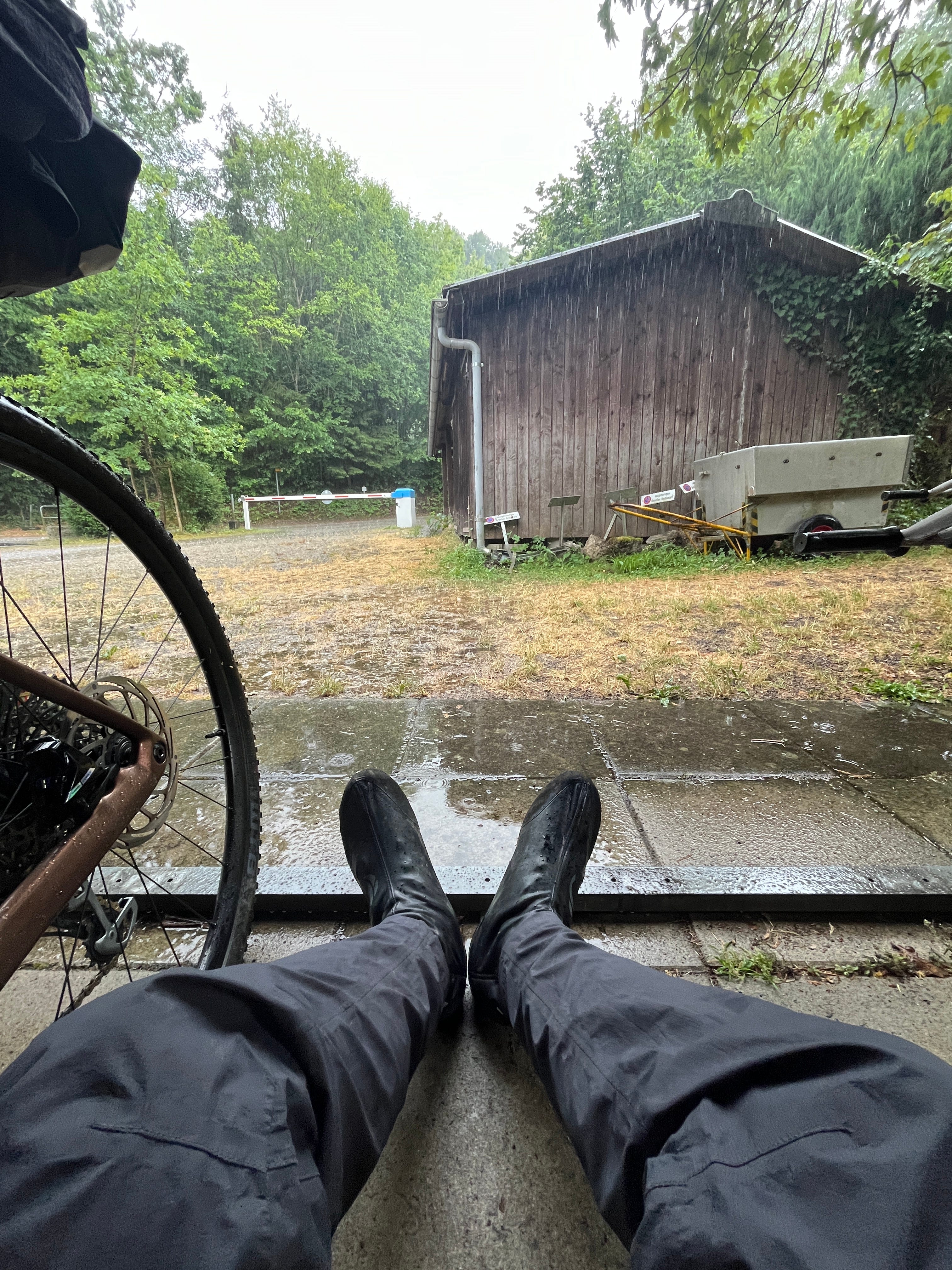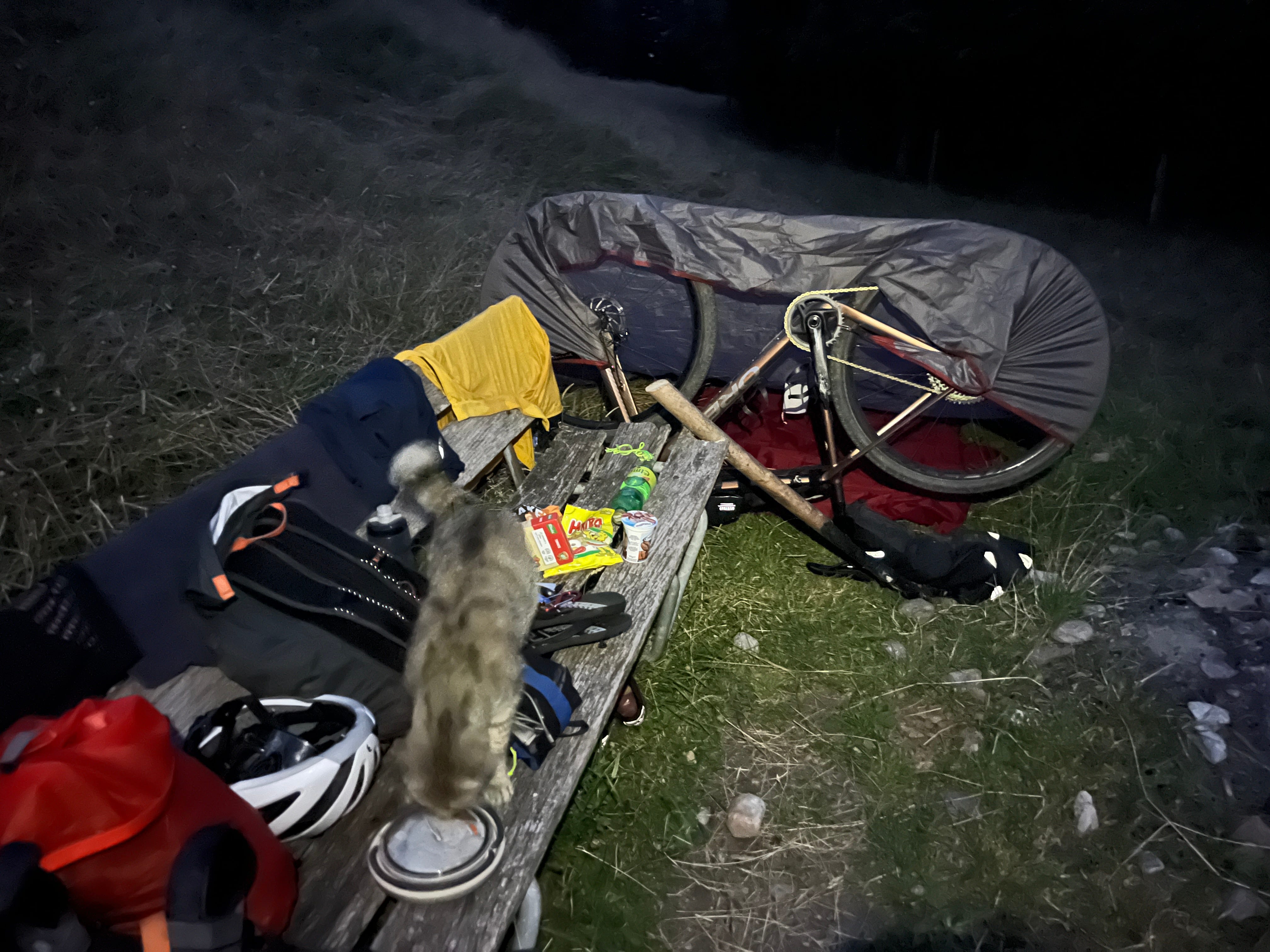 Le temps de laisser passer quelques averses, les astres brillent à nouveau et je gagne le porche de l’église pour dormir abrité d’un divin toit. Tout comme ce premier repas du jour suivant partagé avec quelques motards précoces. Le soleil inonde rapidement la terrasse et fait grimper le mercure, mon énergie et ma motivation pour une nouvelle étape d’envergure.