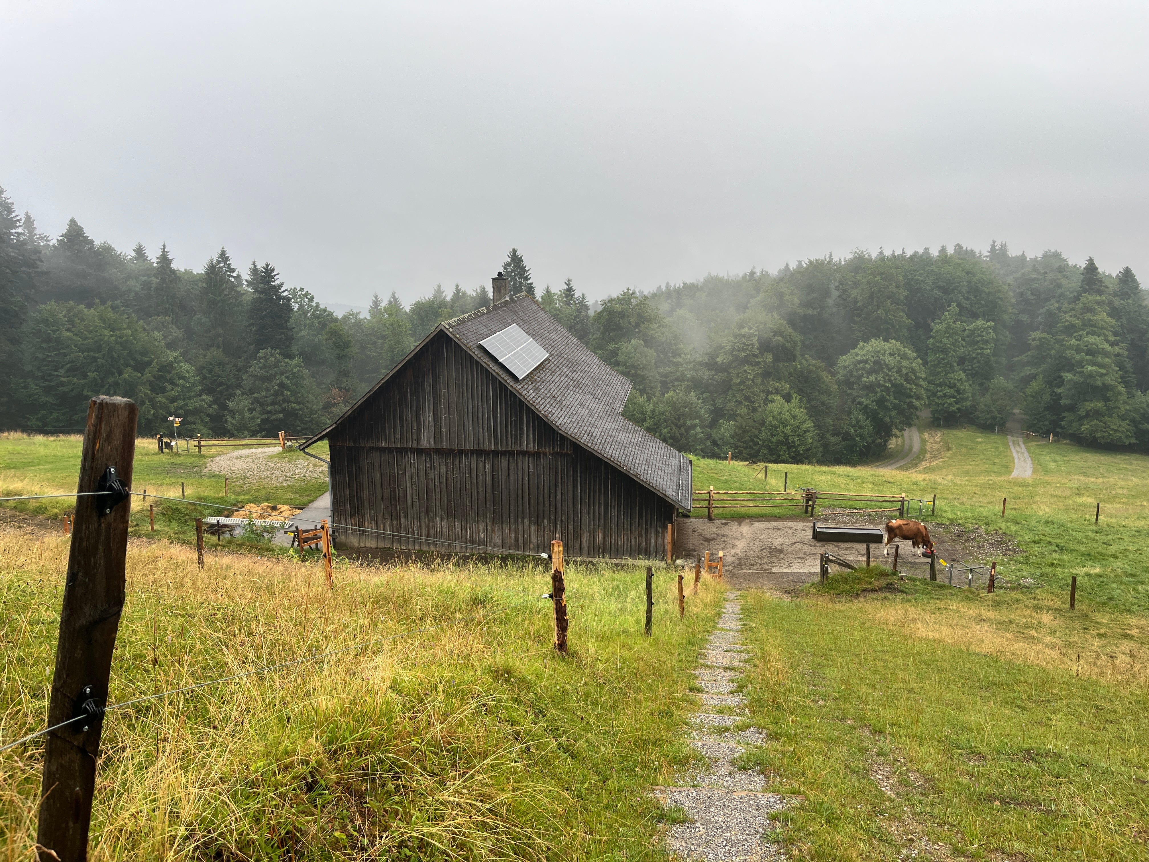 Petit-déjeuner à Turbenthal, dans la brume, avant de regagner de la hauteur sur une jolie crête. En haut, en bas, à gauche, à droite dans un mélange boisé et de gravier. Le chemin me porte désormais en terre St-Galloise dans le Toggenburg. Assurément paysan. Des collines verdâtres parsemées de fermes ou le plat n’existe pas.