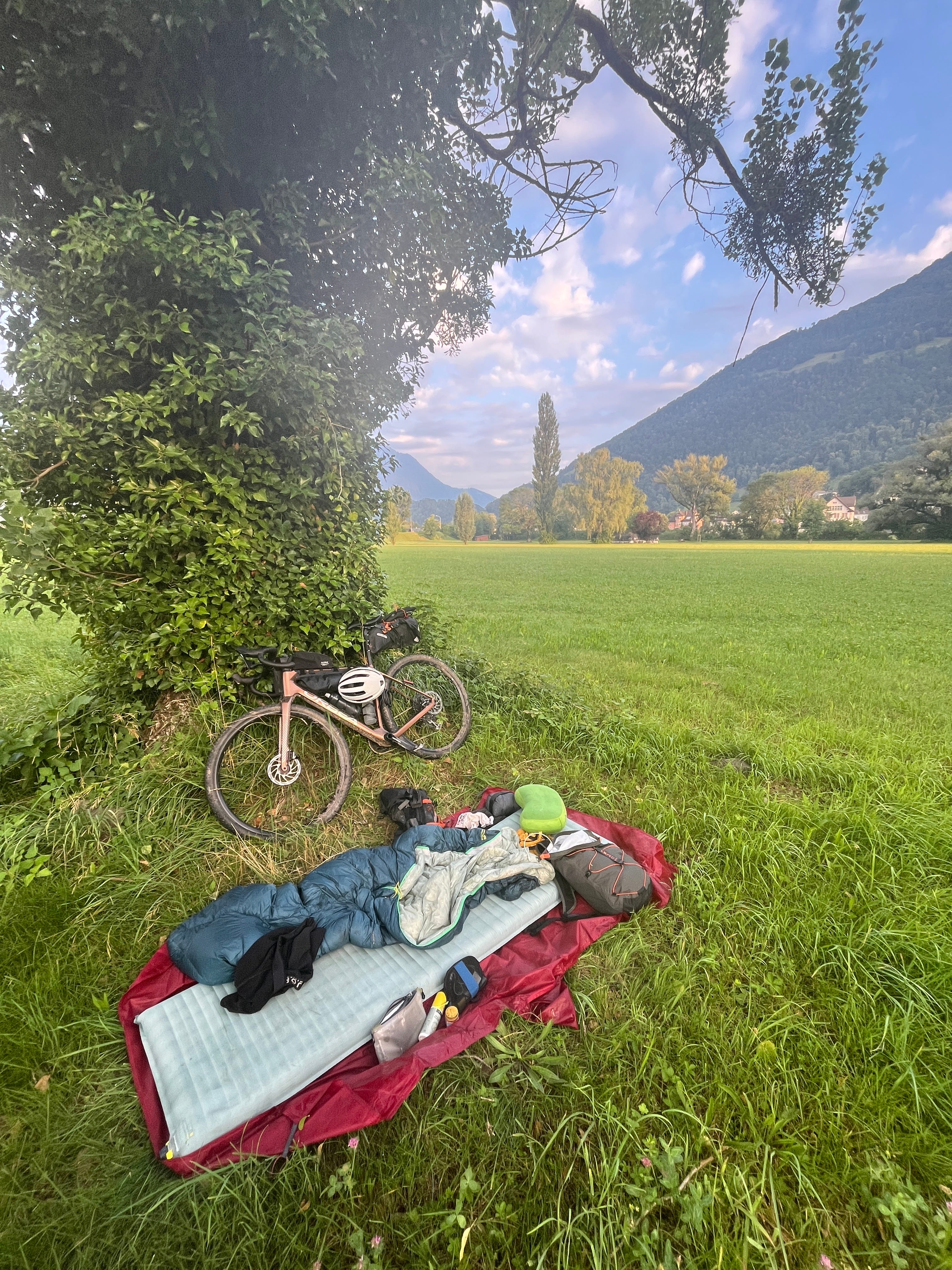 Heureuse arrivée à Weesen avec un agréable contraste de températures. Après cette très longue journée, dévalisement d’une pizzeria avant de trouver un coin proche d’un arbre dans une grande plaine longeant le fleuve de la Linth. Je m’endors en regardant les étoiles. Ma dernière nuit agitée semble à des années lumières.