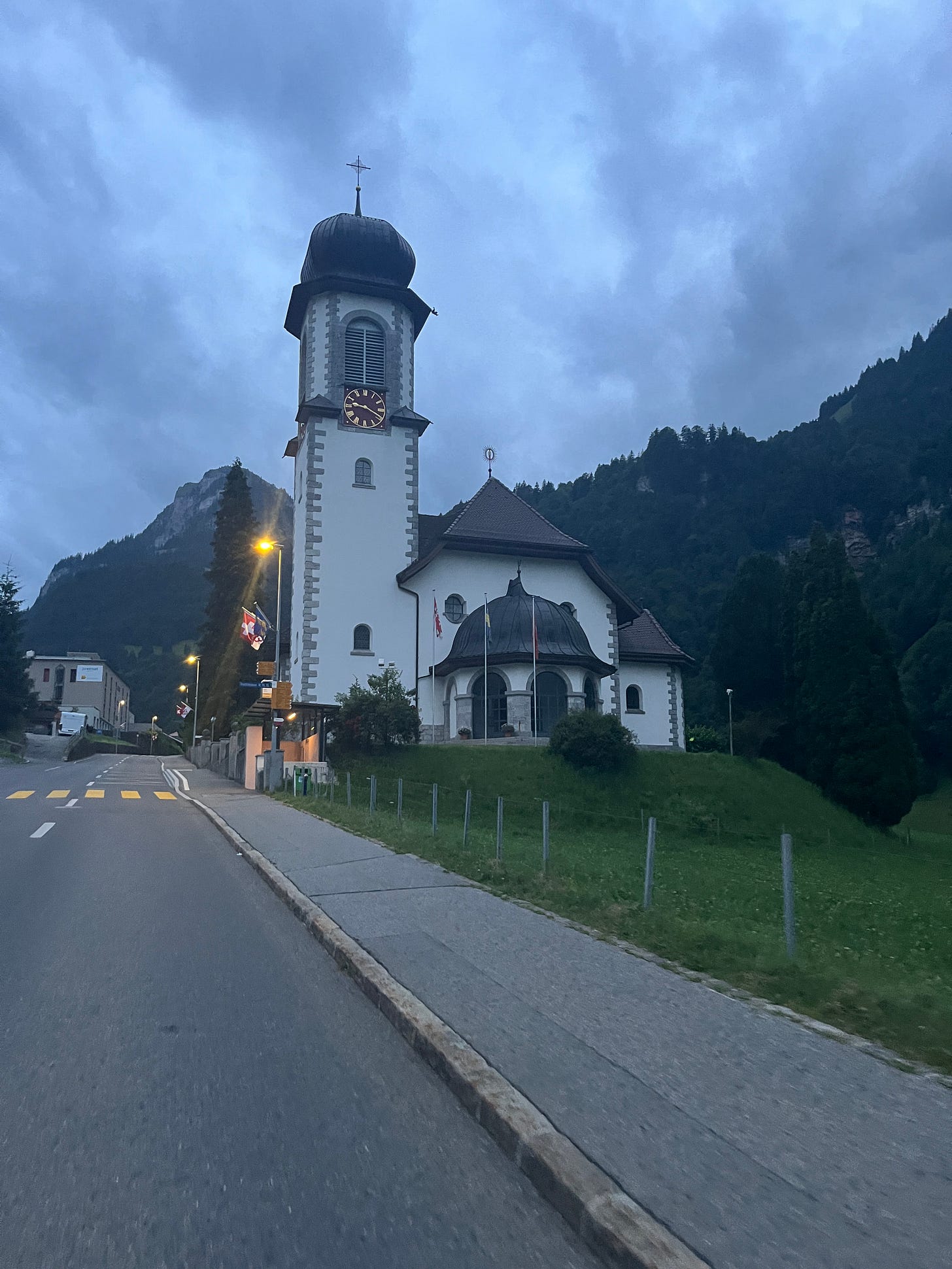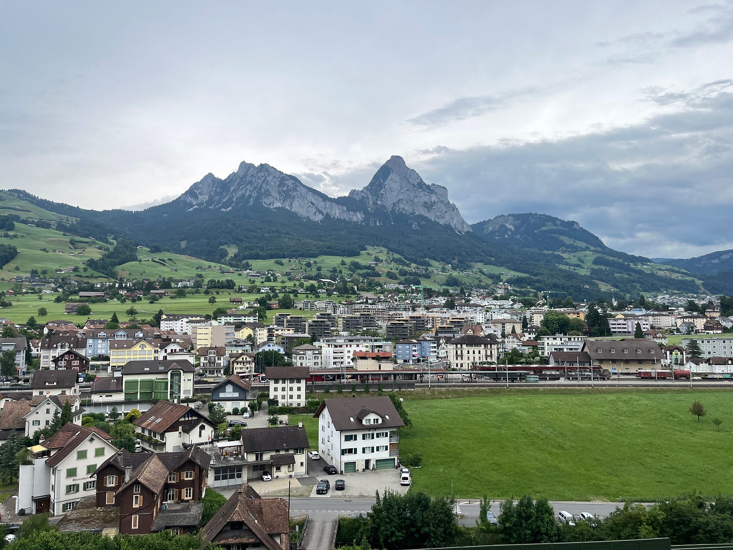 Un égarement et une casse de rayon plus tard me voilà 1000 mètres plus bas à Schwytz & Seewen. Je me restaure proche d’une église avec non loin deux adolescentes écoutant de la musique et deux femmes voilées en pleine discussion.