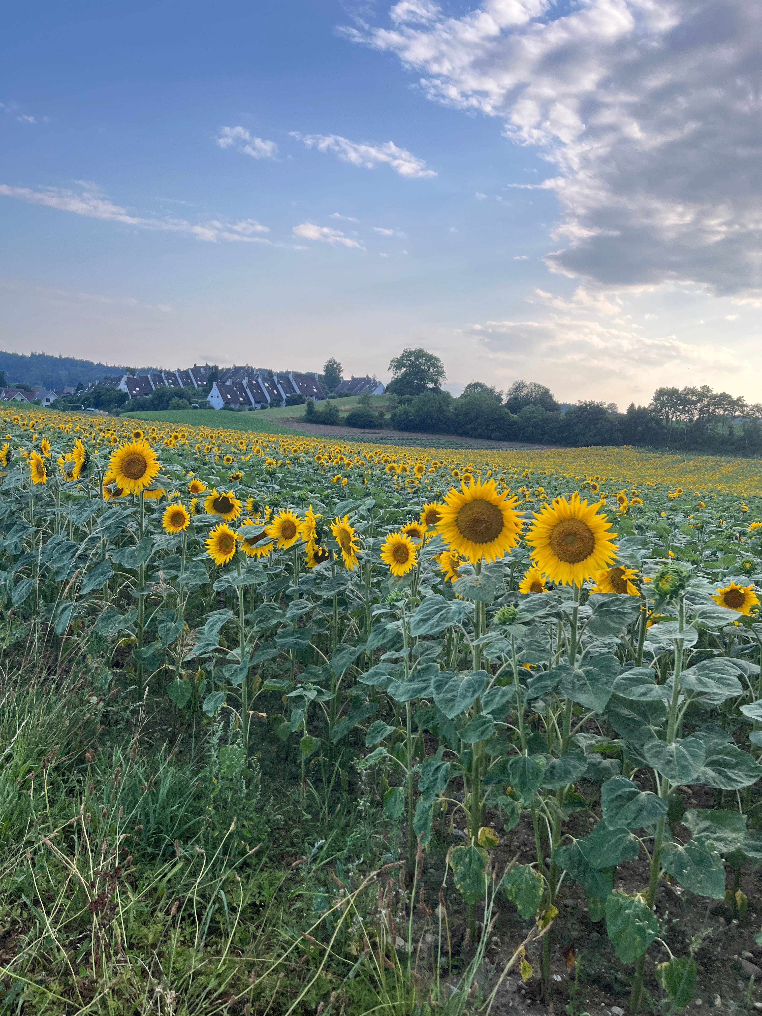 Campagne paysanne, de vastes étendues de champs vallonnés, et des tournesols pour attirer un soleil timide à l’horizon. Attaques de taons avant de plonger sur la ville de Winterthour. Le jour diminue, les terrasses se remplissent et s’animent. Une grande fontaine me rafraîchit et complète mon stock d’eau pour la suite.