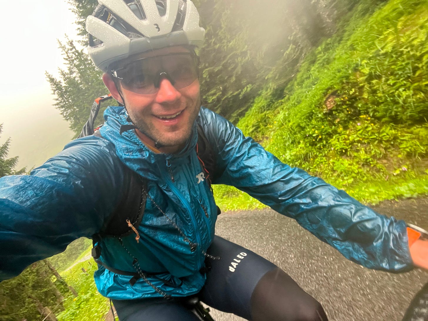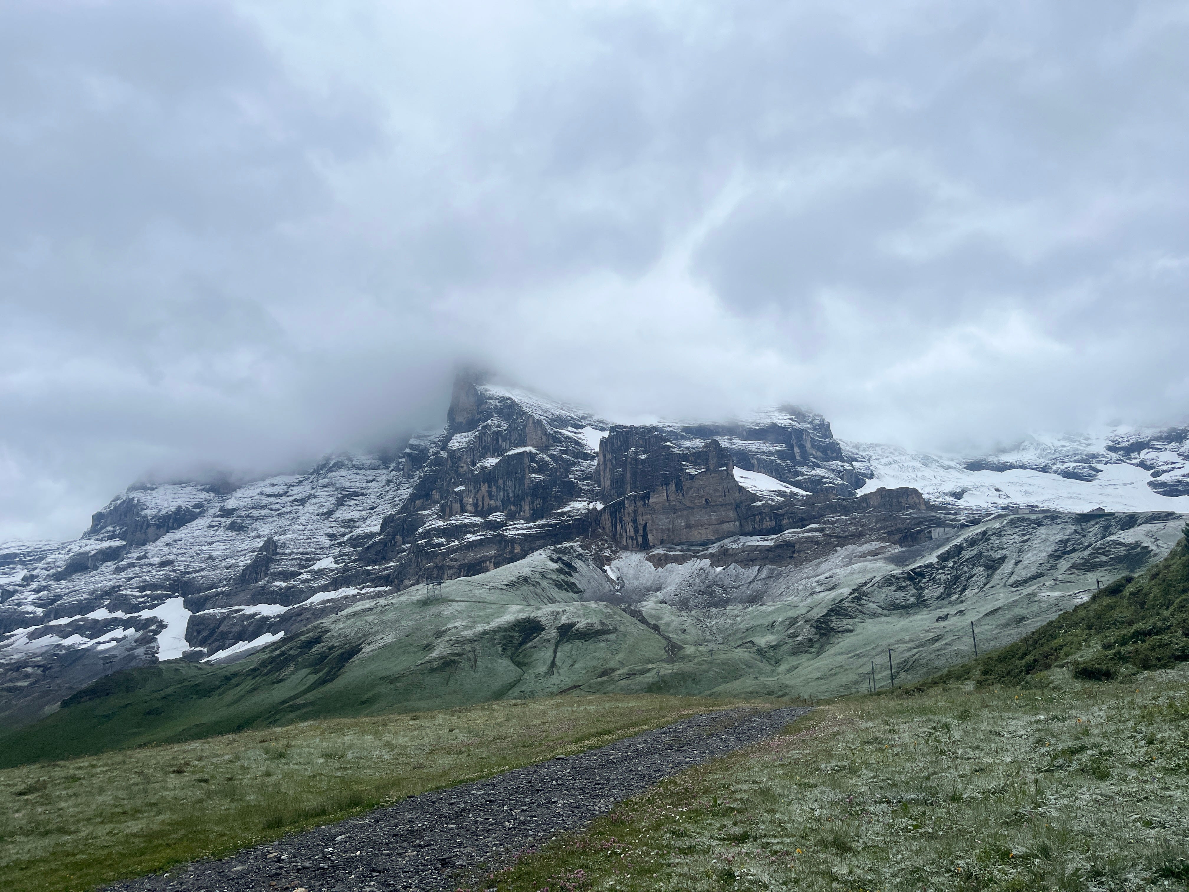 Les jambes tournent avec aisance. Le plaisir suit. Plus le but se rapproche, plus la pente augmente, et la pluie renchérit. La neige tapisse les contreforts du col en vue. Bien présente, l’Eiger, comprenez L’Ogre dans sa version francophone, est à imaginer aujourd’hui. Ses dents dissimulées sous un opaque voile blanc.