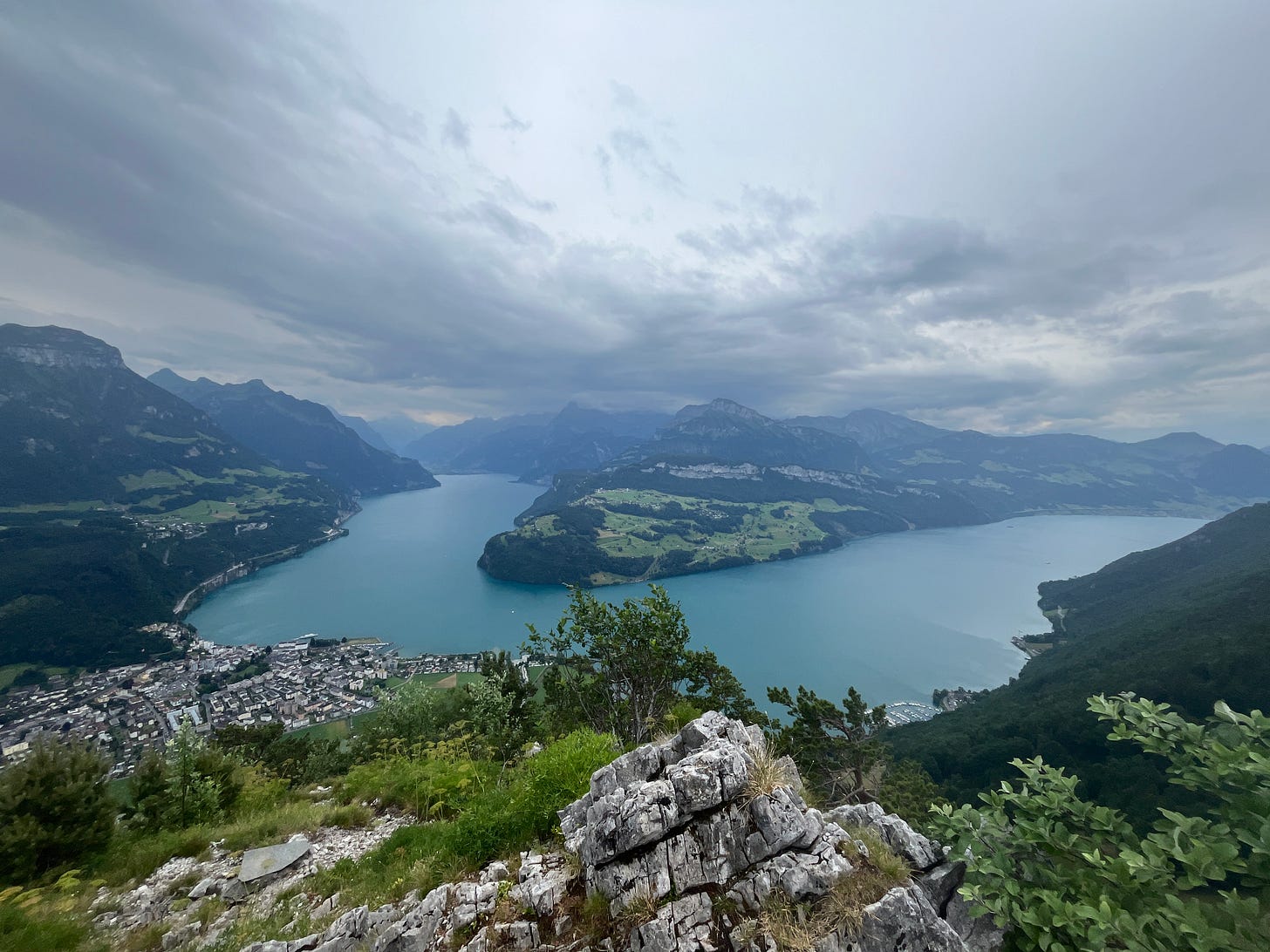 Le milieu d’après-midi passé, la chaleur assommante, il faut générer de nouvelles ressources. Une montée raide à souhait où le goudron laisse ensuite place à des pierres obligeant une progression pédestre. Quelques pas de grimpes sur un court sentier bleu-blanc, et ces efforts récompensés par une vue dominant le lac des Quatre-Cantons depuis le lieu-dit Stockflue.