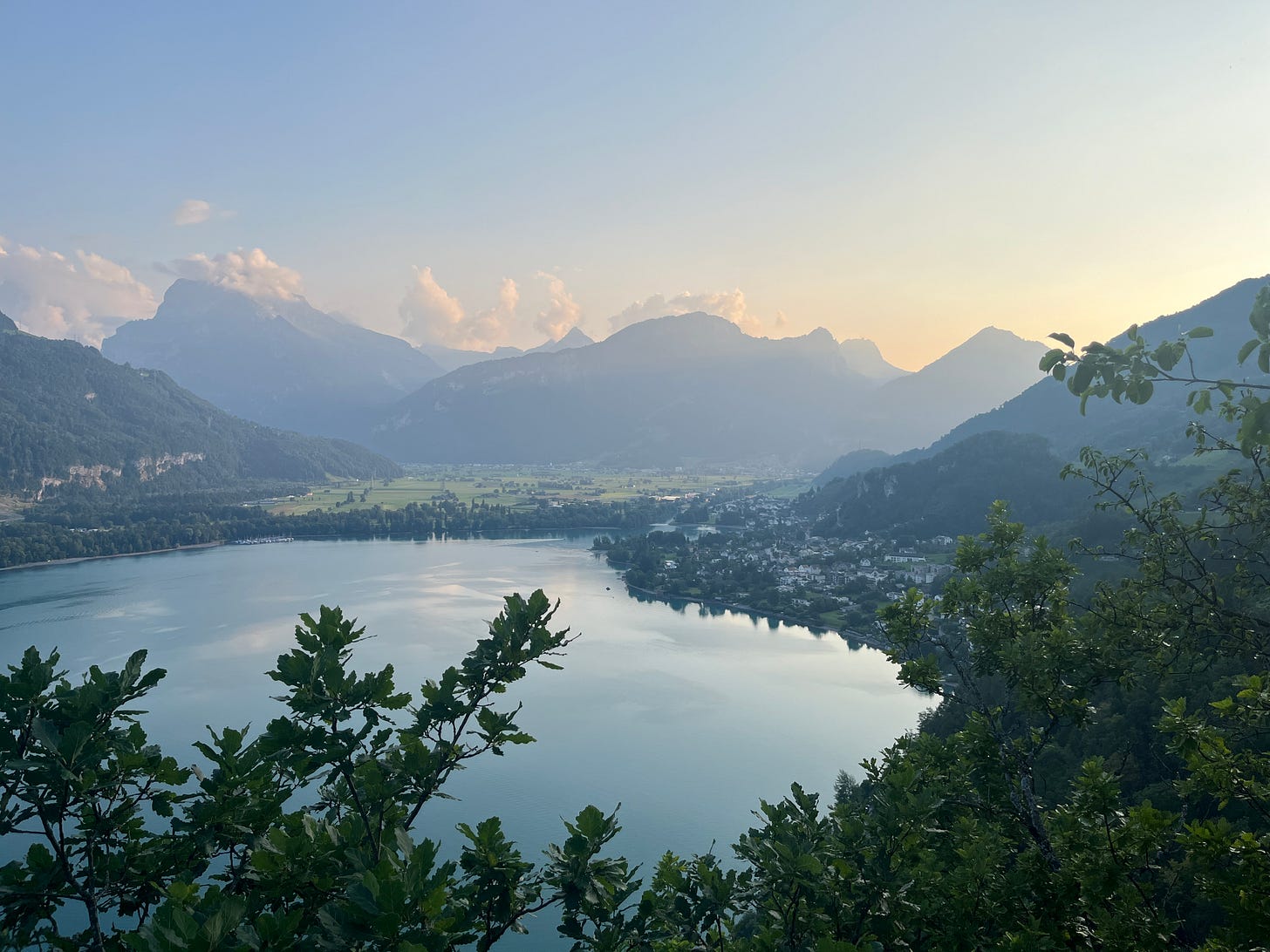 Pile à l’heure au sommet pour savourer encore quelques rayons de soleil, un rafraîchissement au bassin en canine compagnie. Place désormais à une descente vertigineuse et majoritairement goudronnée sur Walensee. La nuit tombe.